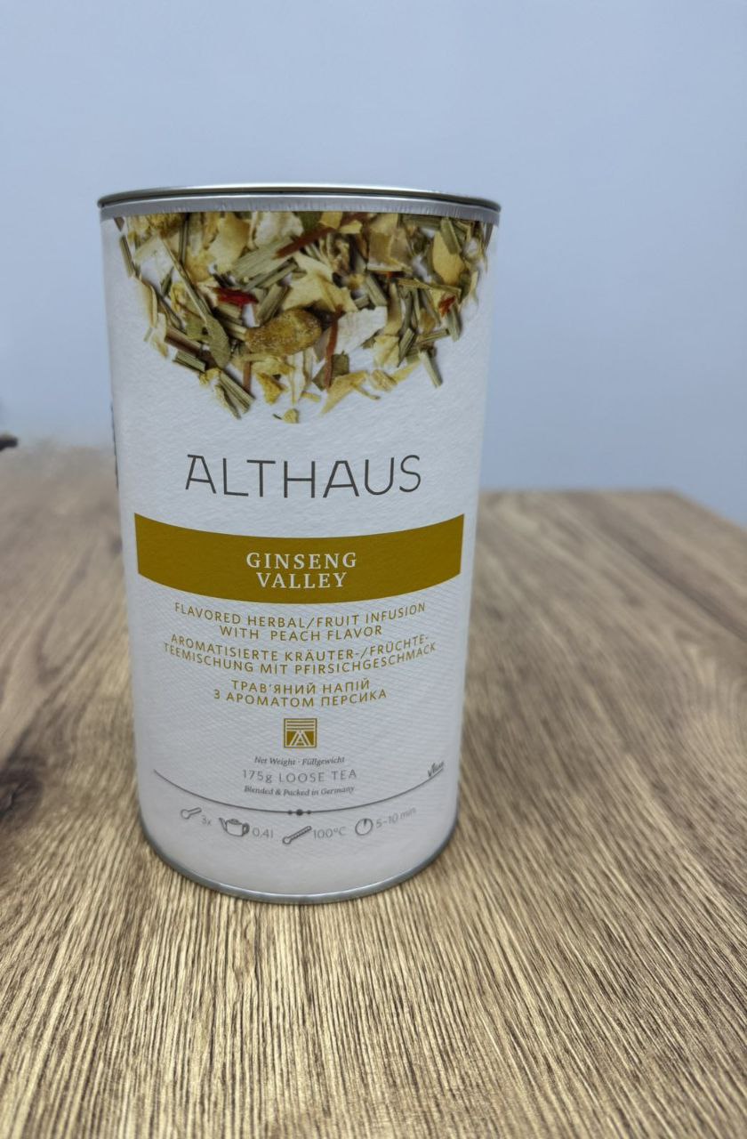 Женьшеневая Долина — специальный напиток в основе которого женьшень и полезные для здоровья травы. В этой прекрасной композиции сочетание аромата весенних одуванчиков, свежего лимонника, лесного зверобоя, благородного сандала, листьев березы и ранней крапивы. Завершает композицию освежающее послевкусие цветочно-травянистых нюансов. Спелый персик и цветы апельсина делают этот уникальный настой очень полезным. Благодаря тонизирующему эффекту различных трав и женьшеня чай прекрасно подходит для утреннего чаепития.
